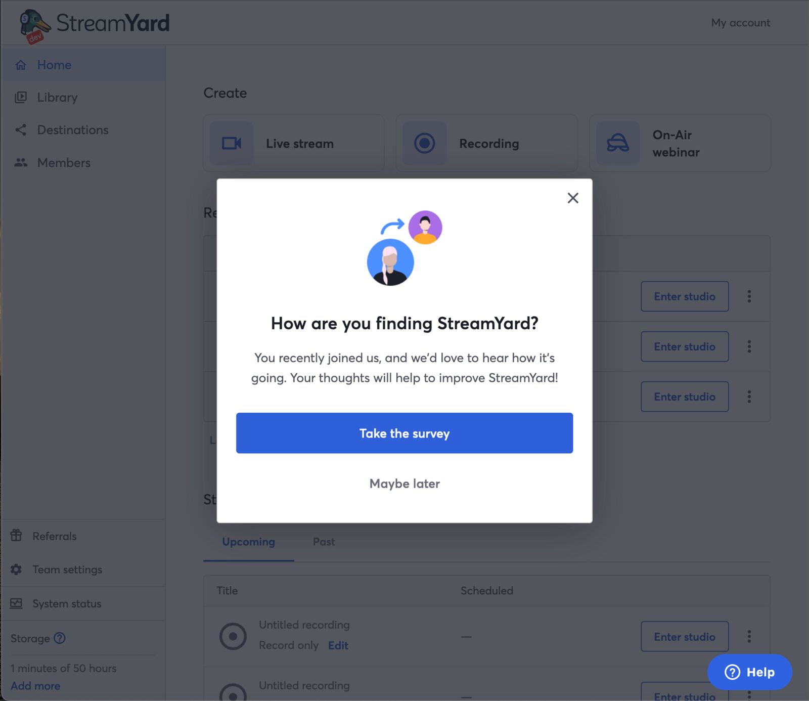 I added some logic so that, after release, once the user landed on the dashboard after exiting the studio (which is typically done after finishing a broadcast) for the third time, a modal would appear. If they dismissed it, it would reappear on the 6th time. If they took the survey, it wouldn’t appear again.