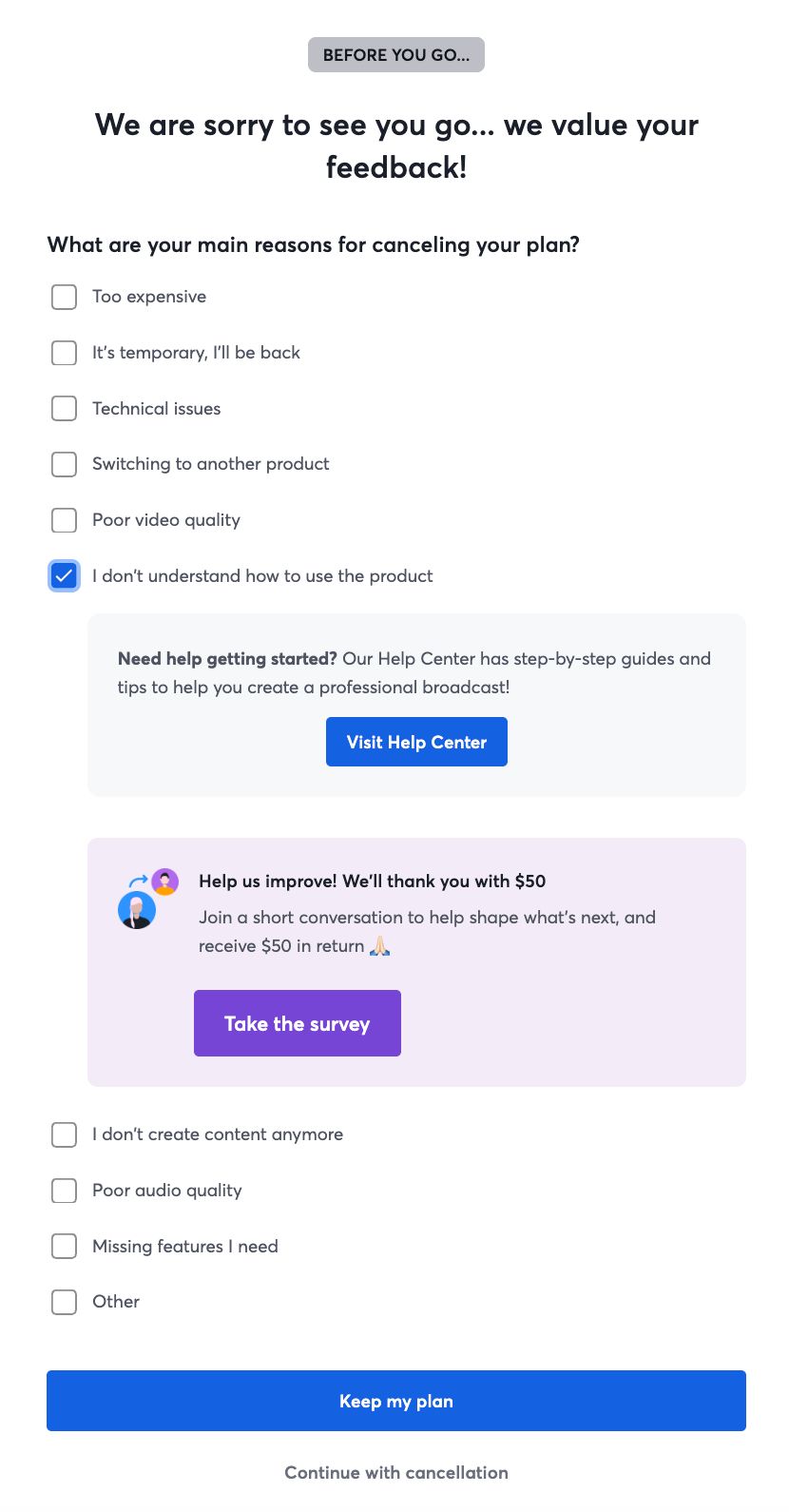 I updated the flow to include a step for users to be able to take the survey on why they are leaving the product, which is also invaluable for us to know.