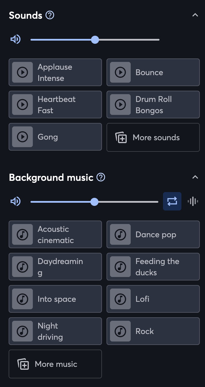 As part of the new QoX squad, I recently worked on implementing “Sounds”. StreamYard has had “Background Musics” in the “Media Assets” tab for a long time - this allows you to play any of the 8 example musics we provide, or to add your own and play them during a broadcast. We offer the ability to loop them, and fade in and out.